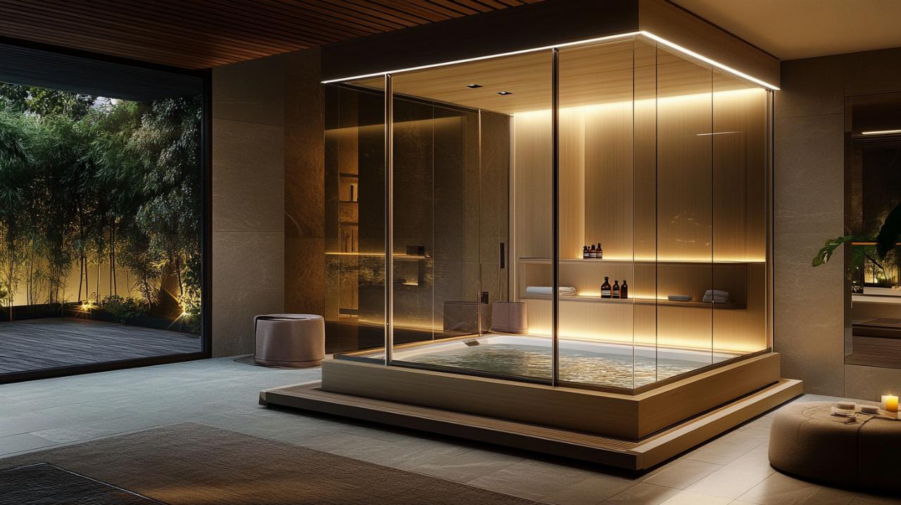 Les raccordements hydrauliques constituent une phase technique qui nécessite des compétences en plomberie pour garantir l'absence de fuites et le bon débit d'eau vers les différents systèmes. Le branchement électrique doit impérativement respecter les normes en vigueur, avec une protection différentielle adaptée et une mise à la terre conforme. Le générateur de vapeur pour le bain turc nécessite une attention particulière lors de son installation, car il doit être positionné de manière à optimiser la diffusion de la chaleur tout en respectant les distances de sécurité avec les autres composants électroniques comme l'écran tactile ou les haut-parleurs.